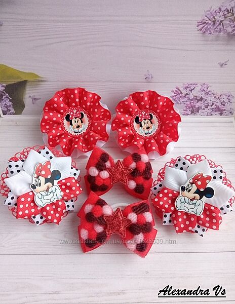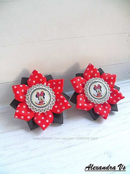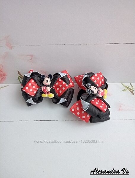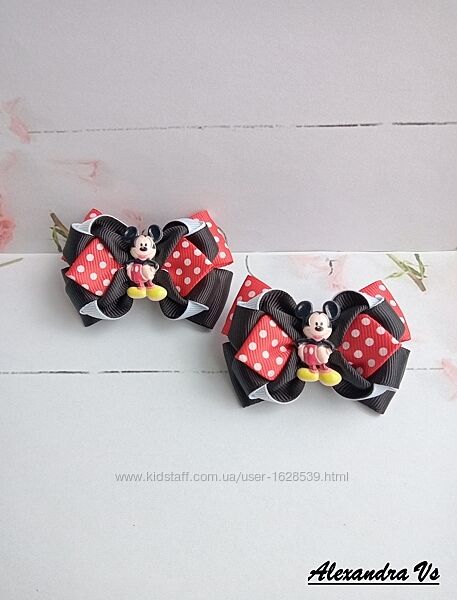 Яркие бантики из репсовой ленты с Минни Маус. Диаметр бантика 7,5 см - 8 см. Надежно закреплены на нейлоновые бесшовные резинки. В наличии. Цена за пару указана под фото