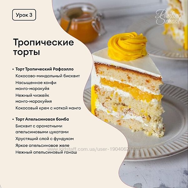 В программе курса торты, которые угодят любому. С чизкейками внутри, муссами, креме, компоте, конфи, хрустящими слоями.