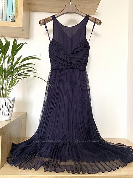 Красивое вечернее платье в темно фиолетовом цвете. По спинке возле замка есть кружево. Смотрится очень красиво и нарядно. Ткань легкая, шифоновая. Есть подкладка, не светится. Лейба срезана, бирка етсь.Замеры: Пог 45, пот 33, поб свободны. ткань не тянется. Длина 119