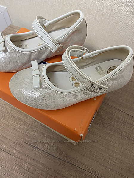 Очень красивые туфельки, верх как парча бело-серебристыеремешки и бантик - белый лак