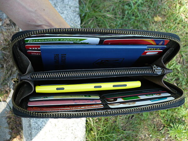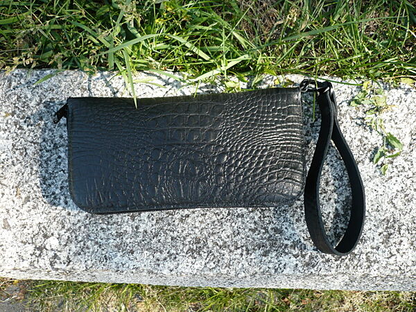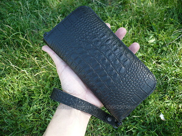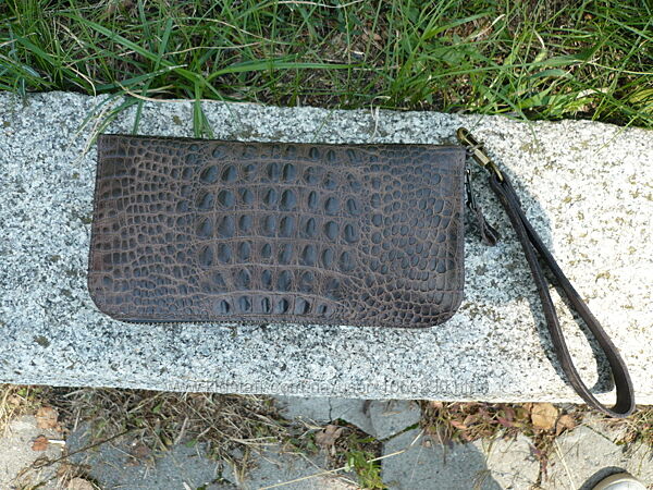 Кошелек зиппер. Выполнен из двух видов кожи черного или коричневого цвета. Внешняя часть: кожа КРС с тиснением под крокодила на лицевой поверхности ( Турция ); внутренняя часть: кожа КРС "crazy horse" (Украина). Молнии и собачки YKK ( Япония ) . Кошелек прошит вощеной нитью 0,35 мм. Размер: 210*110 мм. Функциональность: 4 отделения для купюр, 12 карманов для пластиковых карт, отделение для мелочи. Ручная работа. Ценность: 1700 грн.
