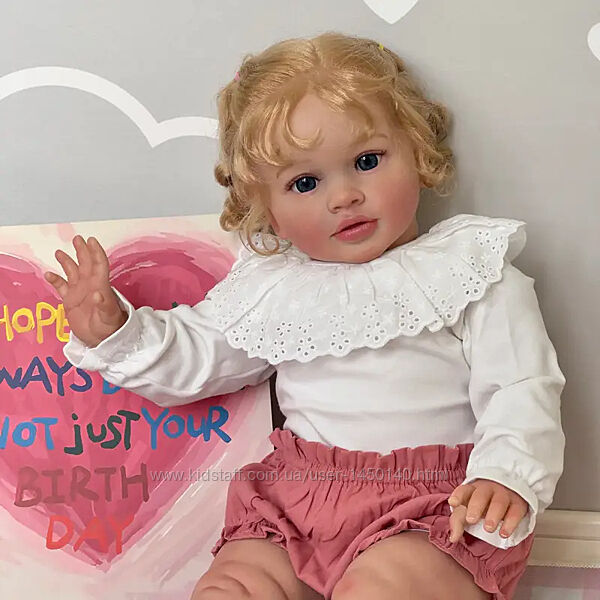 Висота ляльки — 65 см, очі відкриті, не моргають. Кожна волосинка прошита вручну — міцно й акуратно. Лялька виглядає максимально реалістично завдяки складочкам, легкому почервонінню, намальованим венкам і особливому виразу обличчя.
