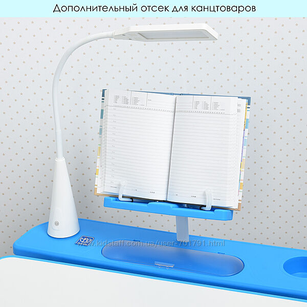Вверху стола есть отсек с подставкой для книг, вмонтированный пенал и углубление для карандашей,