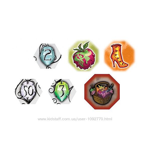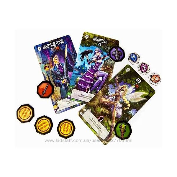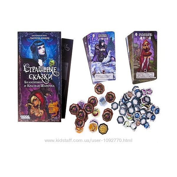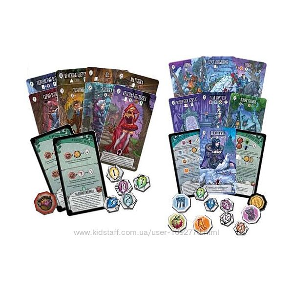 В коробке: 26 карт и 35 жетонов дополнения "Белоснежка", 26 карт и 43 жетона дополнения "Красная Шапочка", правила игры.