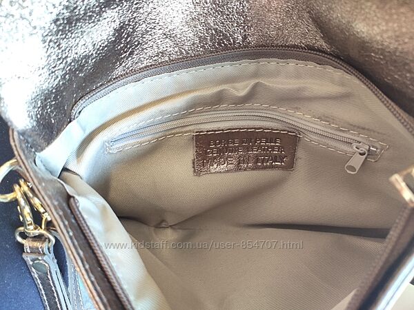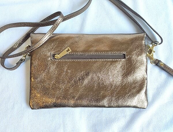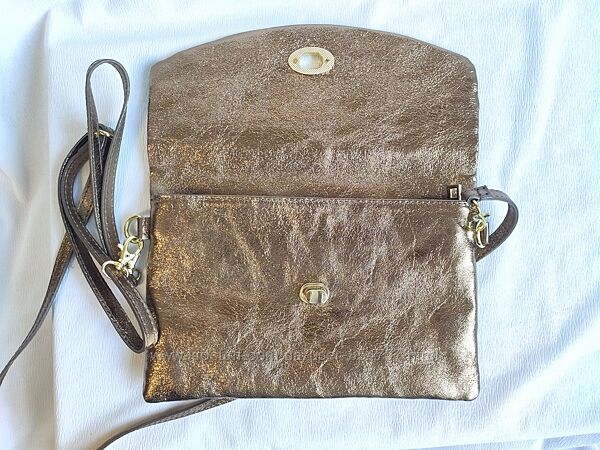 Сумка женская золотистая кожаная нарядная клатч Borse in PelleЭффектная сумка от итальянского бренда BORSE IN PELLE, изготовлена во Флоренции из качественной натуральной кожи с интересной структурой. Закрывается на молнии и клапаном. Внутри одно отделение и карман для мелочей. Наружный карман на тыльной стороне сумки. Ремешки съёмные, можно носить на плече или в руке.