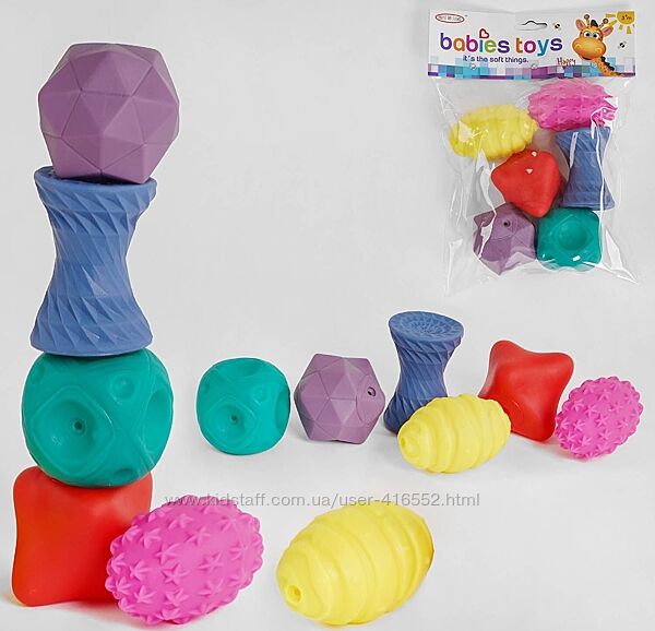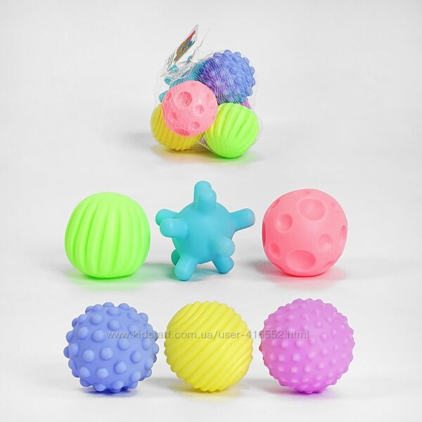 В набор входит 6 мячиков разного размера, цвета и формы.Мягкие тактильные мячики «Soft Balls» для малышей от 3 месяцев.