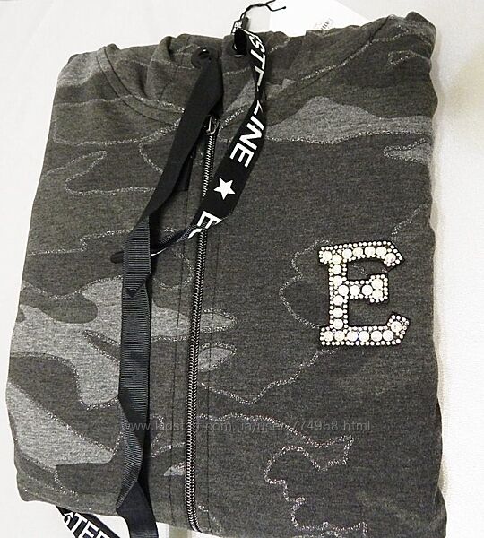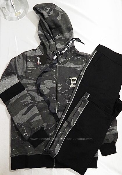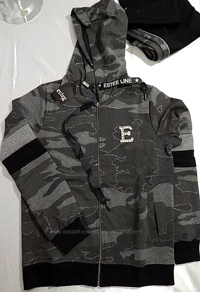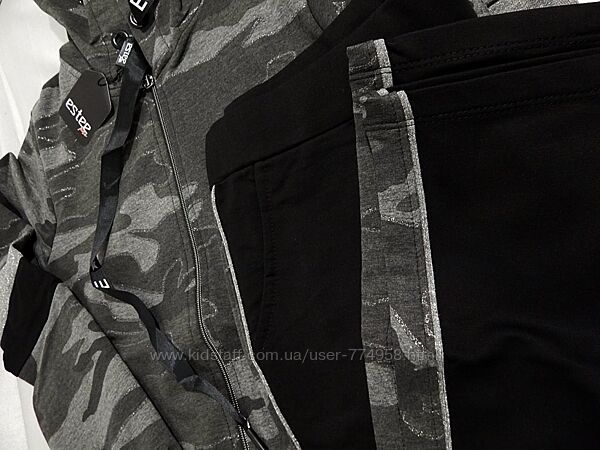 Жіночий спортивний костюм сіро-чорного кольору, з принтом стилю мілітарі. Зручний одяг для занять спортом, відпочинку на природі або костюмом в поїздку. Щільний трикотаж двунитка, є комфортним в носінні та практичним в пранні. Особливість даного костюму, полягає в невеликих ошатних акцентах, таких як злегка сріблясті контури цяток хакі і емблемою літери «Е» зі скляних каменів на грудях, що переливаються. Спортивний костюм в дорогу дуже зручний при подорожах на будь-якому транспорті. Штани без ременя не тиснуть при сидінні, немає необхідності виймати ремінь при проходженні через металошукачі. Кофту завжди можна зняти якщо буде жарко і навпаки надіти якщо стане прохолодно, при цьому кофта не займає багато місця і може бути зав´язана на стегнах або накинута на плечі. І, звичайно ж, пряме призначення спортивних костюмів це заняття спортом, і це тренд сучасного світу. Дана модель, складається з класичної спортивної кофти і штанів. Кофта застібається на блискавку, має капюшон з затягуванням на шнурку. Також є дві бічні кишені. Основний колір кофти сірий хакі, вставки на рукавах смужки сірого люріксу і чорного трикотажу. Манжети і низ кофти - чорна трикотажна гумка. Штани чорного кольору, по боках лампаси з сірого матеріалу, такого ж, як кофта. Штанини прямі, знизу без манжет. Матеріал щільний трикотаж, склад тканини: 70% бавовна, 25% поліестер, 5% лайкра.Турецька фабрика піжам DiKa відома нашим покупцям, як виробник якісних домашніх халатів і піжам, а також лінією елегантних пеньюарів. Тепер дана фабрика випускає спортивну серію одягу для жінок під брендом ESTEE line. Всі вироби, так само як і лінія халатів і піжам, мають знайому упаковку у вигляді прямокутної сумки на блискавці з гачком-вішалкою. Це виріб високої якості, має фірмову упаковки, і може стати прекрасним подарунком собі або своїм близьким.