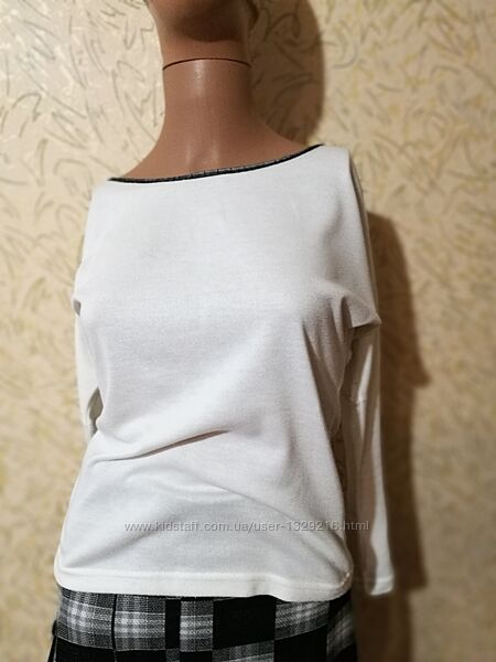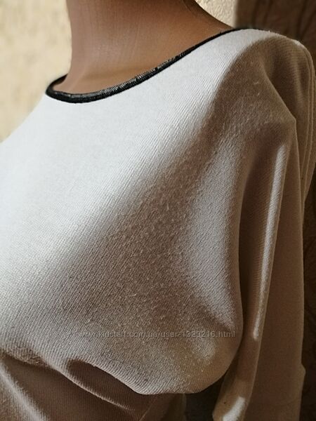 Красивенькая и милая кофточка) Размер S, должна сидеть немного свободно. Состояние - есть катышки, в основном где соприкасаются руки и тело, материал - тонкий трикотаж, состав не знаю, цвет молочный. На себе не сфотографирую (я в нее просто не влезу). Покупка в каком-то из сетевых магазинов, по типу Остин, Оджи не помню уже...