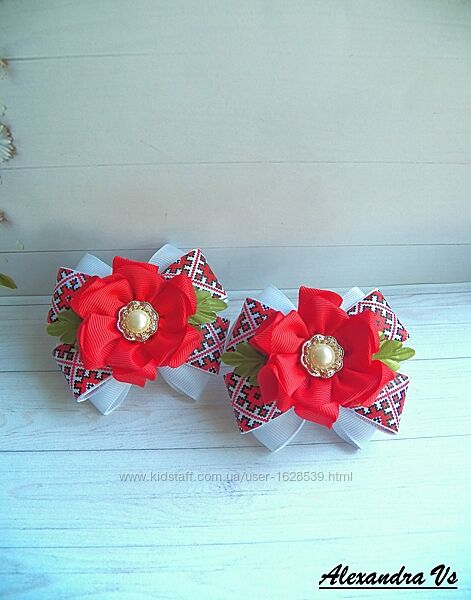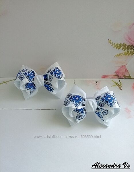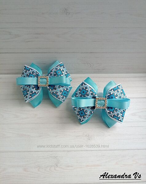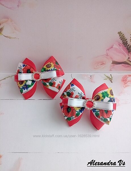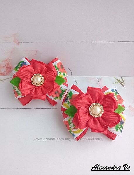 Яркие бантики из репсовой ленты с орнаментом. Длина бантика 8,5 см. Надежно закреплены на нейлоновые бесшовные резинки. В наличии. Цена под фото указана за пару.