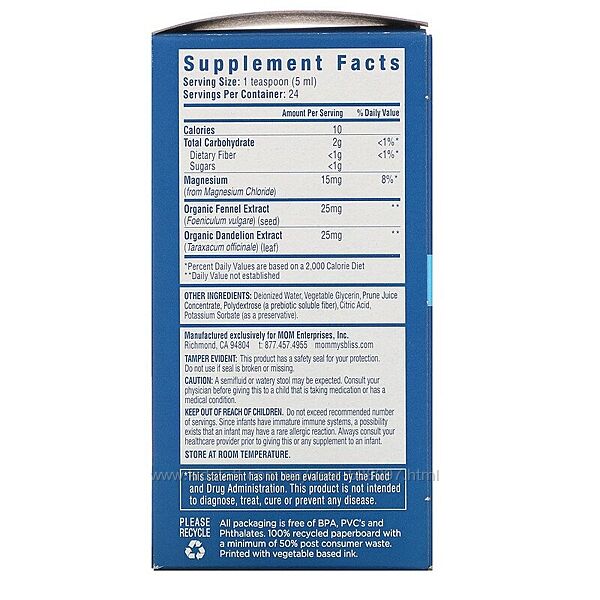 Детское средство против запоров Mommy´s Bliss представляет собой безопасный и эффективный жидкий растительный продукт, предназначенный для улучшения перистальтики кишечника и устранения периодических запоров.