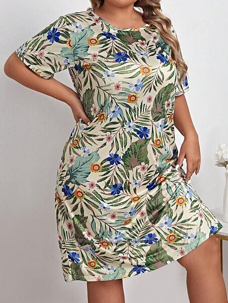 Ночная рубашка или платье для дома больших размеров с тропическим принтом фирмы Shein. Размер 56 (4XL). Может подойти на 58.Окружность запястья 50,6 см, плечо 51,5 см, длина 116 см, длина рукава 22,1 см, окружность груди 134 см, окружность руки 53,6 см.