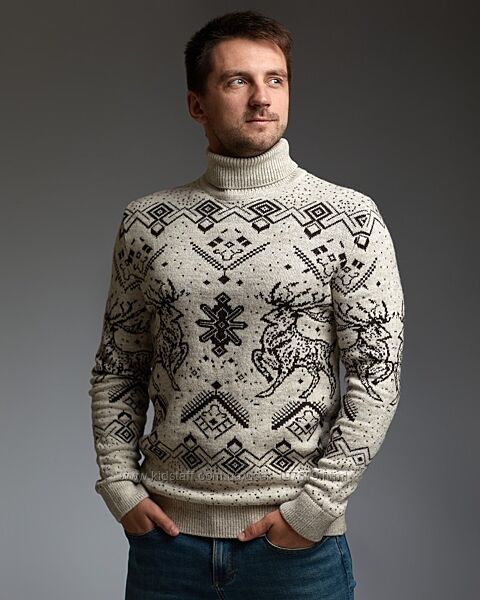 Теплый мужской новогодний свитер с оленями, мужская водолазка, новогодний гольф с оленями, гольф с подвернутой горловиной.Размеры и замеры на фото.