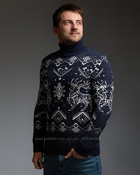 Подробное описание: Мужской теплый гольф, новогодний свитер с оленями, с подвернутой горловиной