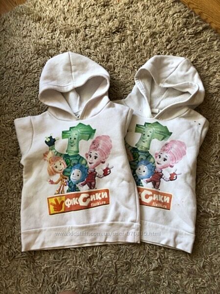 7. Толстовка на флисе с капюшоном белая с принтом Фиксики, размер 3-4 года, 100% коттон, имеется несколько пятен