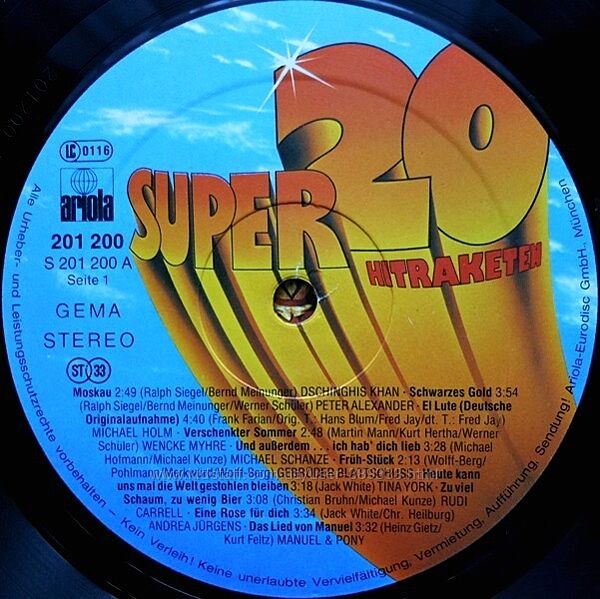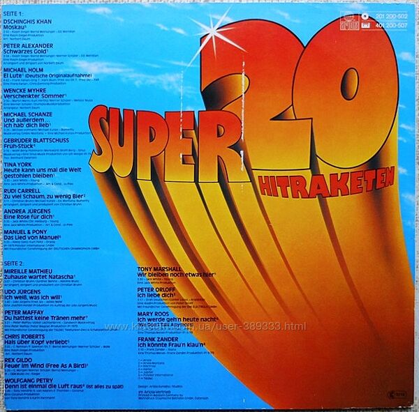 В сборник вошли: Dschinghis Khan, MireilleMathieu, Chris Roberts, Peter Maffay, Tony Marshall, Peter Alexander и др.Various – Super 20 - Hitraketen