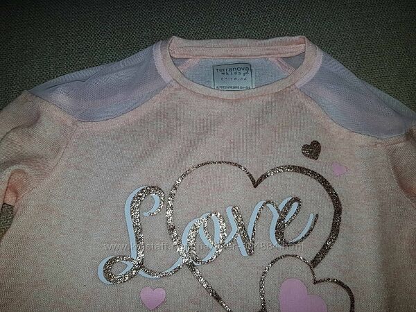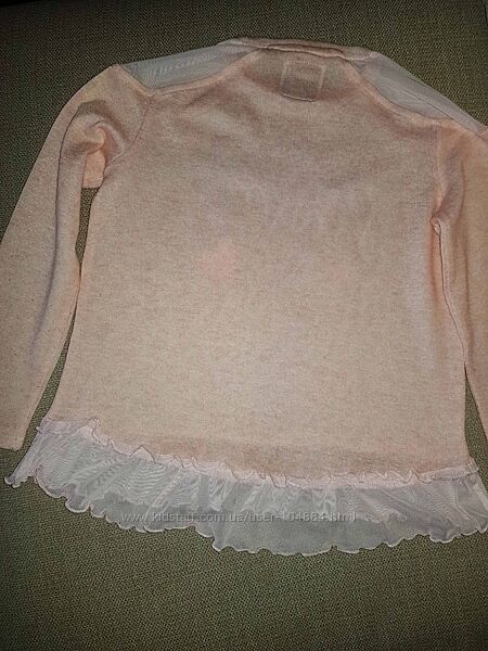 Красивый тонкий свитерок фирмы Terranova; нежного персикового цвета; в плечиках – вставки из розовой сеточки; спереди надпись золотом; по низу идет волан из розовой сеточки; рукав приспущенный. Тянется.Замеры: длина – 48 см, ширина подмышками – 38 см, длина рукава от горловины – 50 см.