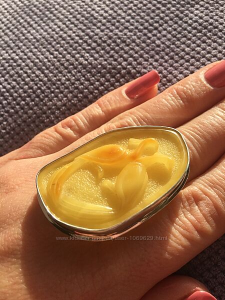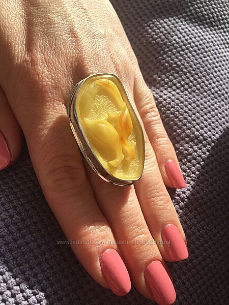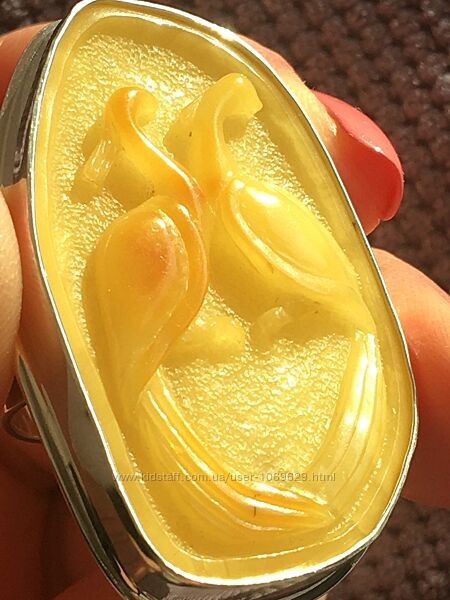 Серебряное кольцо с натуральным янтарём. Резьба по янтарю «Павлины».Размер кольца 18.