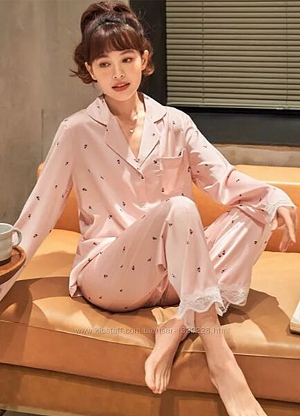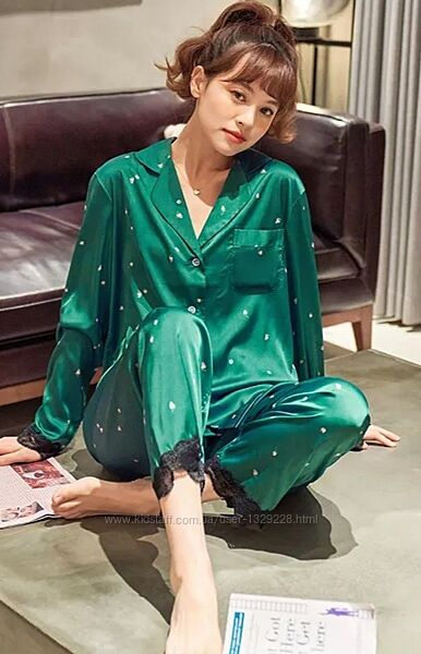 Супер красивая атласная пижама кофта+брюки, украшение кружево чёрного цвета, застежка пуговицы.Цвет розовый, ярко изумрудныйРазмеры
