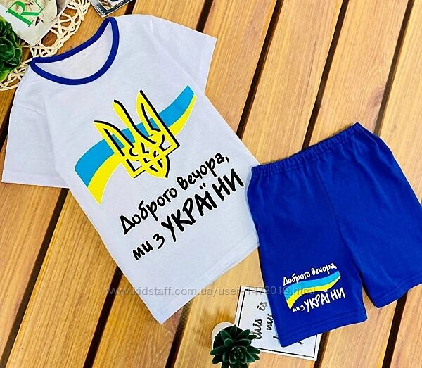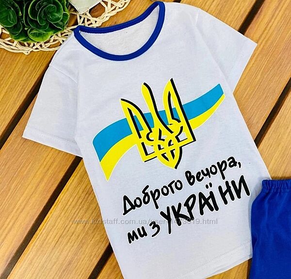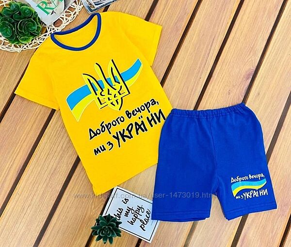 ВК ВК Дитячий патріотичний літній костюм двійка футболка і шорти підійде і хлопчикам і дівчаткам . Футболка з яскравим накатом Доброго вечора ми з України . З гордістю зроблено в Україні. Це одяг для тих, хто відчуває крила за плечима! Свобода завжди в тренді !Тканина 100% бавовна
