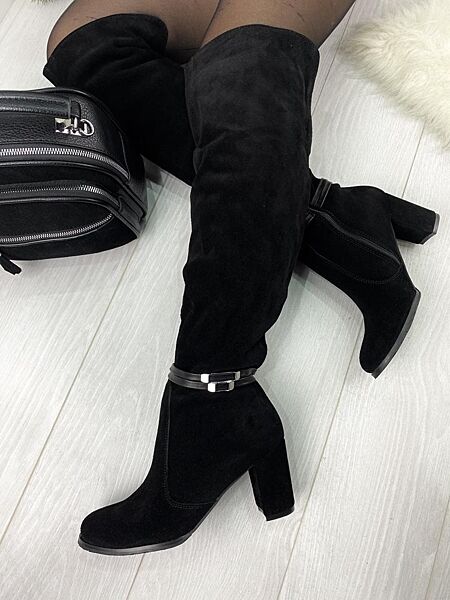 Производство Украины Материал верха: натуральная замша Внутри: байка Высота :50см. Обхват голени :36-39см.+резинка Каблук: 8см. Стелька: 36р.-23см. 37р.-23.5см. 38р.-24.5см. 39р.-25.5см. 40р.-26см. Все фото у нас живые без фотошопа и обработки .Предложения от магазина