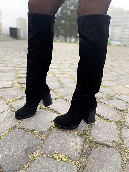 Материал верха: натуральная замша. Внутри: байка Высота сапога от пятки: 45см. Обхват голени :36-39см. Каблук: 8 см. Стельки : 36р.-23.5см. 37р.-24см. 38р.-24,5см. 39р.-25см. 40р.-26см.Предложения от магазина