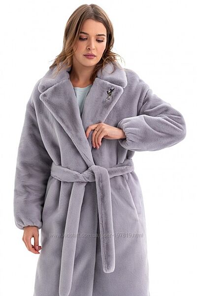 Воротник изделия отложен. Его украшает красивая брошь. По желанию, воротник можно закрыть на сокровенную пуговицу. Есть карманы в боковых швах. Шуба из эко кролика, утепленная слимтексом, шикарно смотрится с поясом.