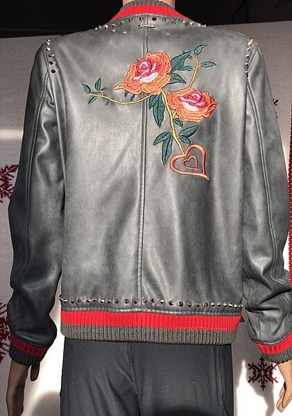 На плечах, вокруг воротника и внизу заклепки в форме золотистых конусов.
