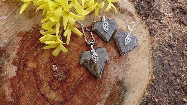 Комплект прикрас ручної роботи Плющ виконаний зі справжніх рослин, а також ювелірної епоксидної смоли.Прикраси роблю власноруч, виконання роботи ідеальне!
