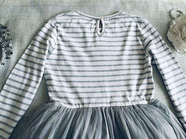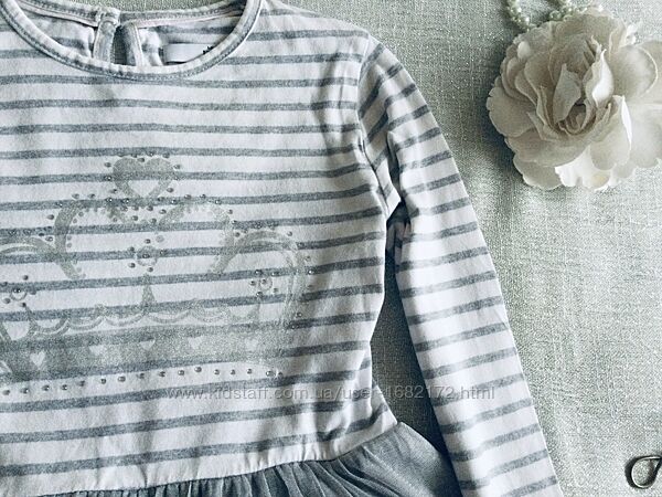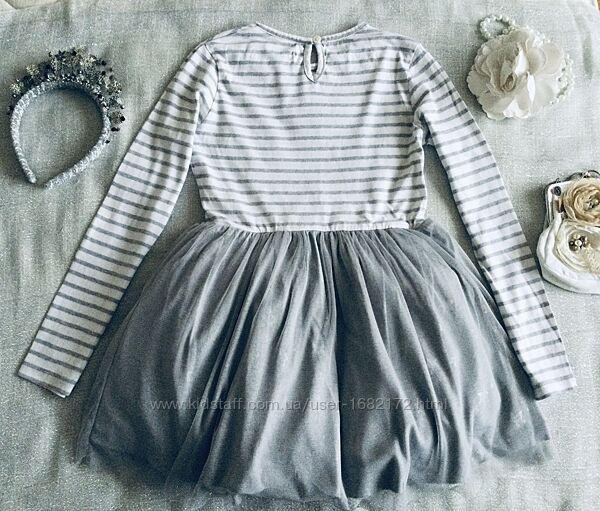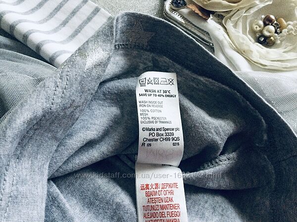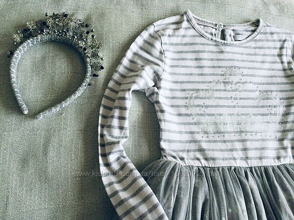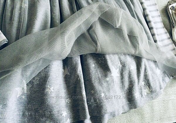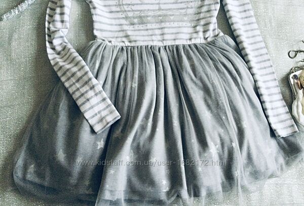 Marks&Spencer (Маркс и Спенсер) пышное, нарядное c длинным рукавчиком. Верх: нежный Трикотажик, на грудке корона из страз , переливается. Низ: фатиновая юбочка на трикотажной подкладочке, усыпана серебряными звёздами , шикарно переливается. Все платье Натуральное! Состояние идеальное.Длина 62; подмышки 34; рукав от ворота 53