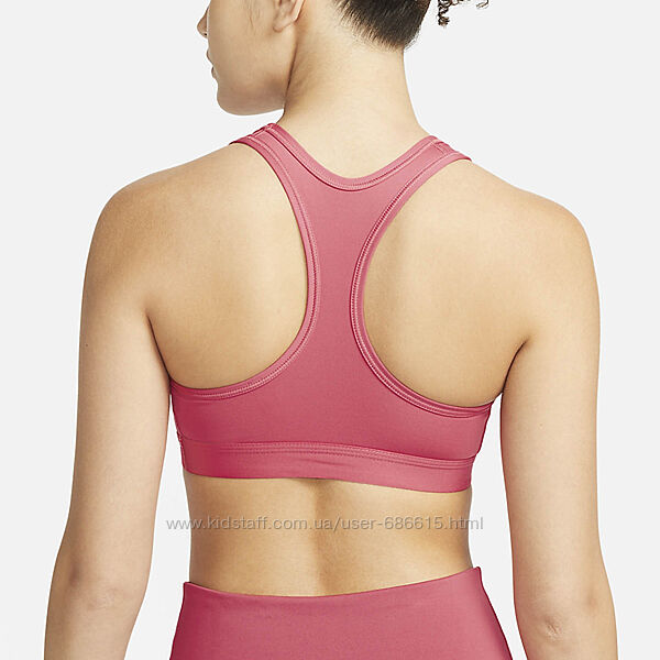 Спортивный бюстгальтер Nike Swoosh без подкладки из компрессионной ткани обеспечивает поддержку при умеренных поддерживающих упражнениях. Резинка под грудью для ощущения мягкости и плотной посадки.