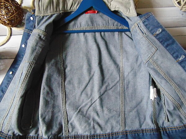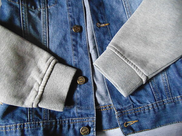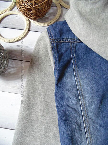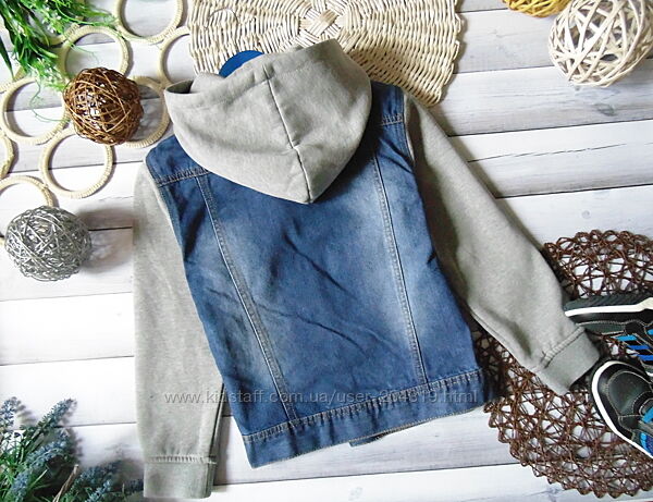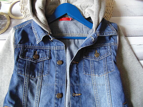 Крутая джинсовая куртка TisSaia на 12 лет,рост 152см с трикотажными рукавами и капюшоном(в рукавах начёс)