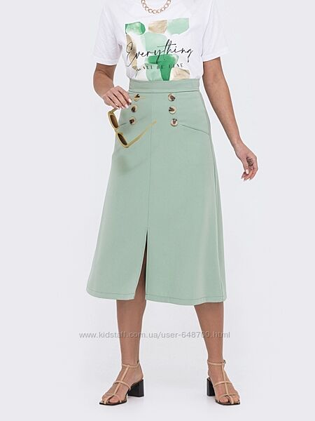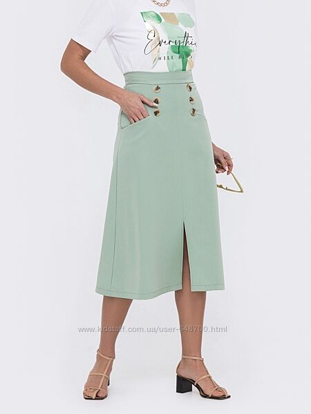 Юбка-трапеция в классическом стиле. Декорирована пуговицами и разрезом спереди. Дополнена карманами. Застёгивается сзади на потайную молнию.