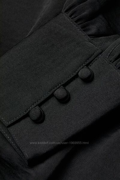 Короткое платье из крепа с воротником стойкой, глубоким вырезом сверху и швом под грудью и на талии. Длинный широкий рукав с широким облегающим манжетом на обтянутых пуговицах. Открытая спинка с широкими лентами на шее и потайной молнией снизу. Трикотажная подкладка сверху.СоставМатериал верха: Полиэстер 100%Подкладка: Полиэстер 100%