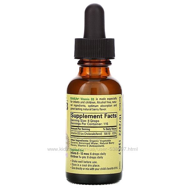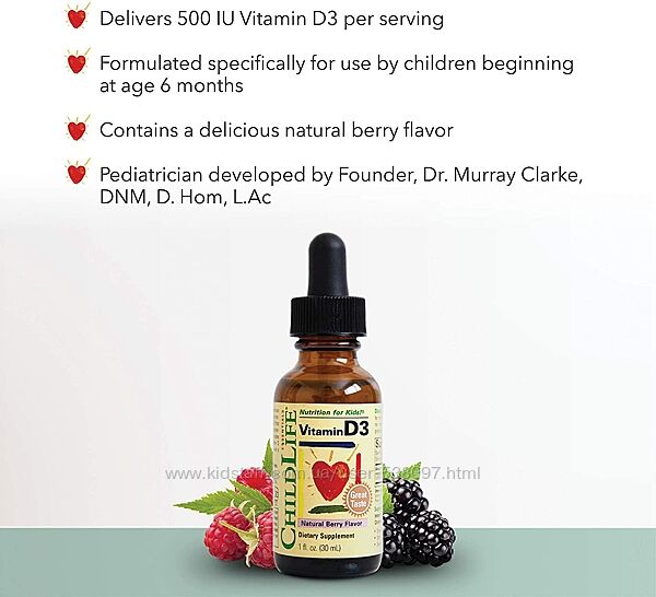 Витамин D3 от ChildLife разработан специально для младенцев и детей. Не содержит спирта, из натуральных ингредиентов, хорошо усваивается и имеет превосходный вкус натуральных ягод.