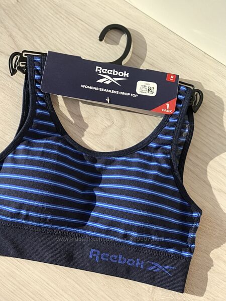 Спортивний топ Reebok, оригінал з бірками.Вкладиші виймаються. Розмір S ближче до XS. Точно не на велику S, я зазвичай ношу розмір S/M, через це виявився замалим.Дуже класна якість. Ширина не розтягненої резинки 27 см.
