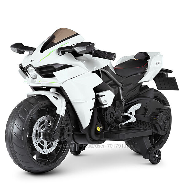 Кожаное сиденье Ширина посадочного места - 15 см Мягкие EVA колесаДиаметр колеса - 35 см, диаметр диска - 28 см Дополнительные страховочные колесики Мотор мощностью 45W / RPM9000Аккумулятор 12V/9AHИндикатор заряда батареиВремя на зарядку - 10-12 часовЗарядка 12V/1500mA, штекер круглый одинарный Старт - поворот ключа, ручка газаПедаль - тормоз Максимальная скорость - до 5 км/ч Переключатель движения вперед/назад - кнопкаСветятся передние и задние фары, подсветка панель приборов Музыка, сигналПанель: MP3, USB разъем, BLUETOOTH Декоративные зеркала заднего вида Максимальная нагрузка - до 30 кг Материал корпуса: прочный пластик Высота до руля - 53 см Высота от подставки для ног до сиденья - 30 смВысота от пола до сиденья - 47 смВес коробки: 17,85 кгВес мотоцикла: 14,25 кгРазмер коробки: 108х38х59 смРазмеры мотоцикла: длина - 120 см, ширина по зеркалам/ по колесам - 50см/53см, высота - 63 см