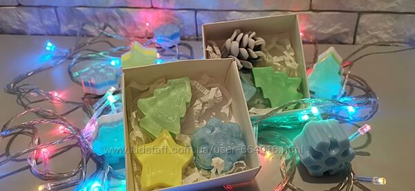 Подарочный набор содержит: 3 элемента из мыла в форме снежинки и шишки.