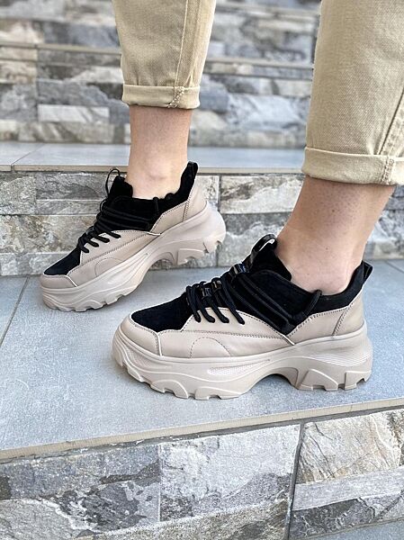 Кроссовки женские RONE 019 капучино/чёрные весна-осень натуральная замша ко