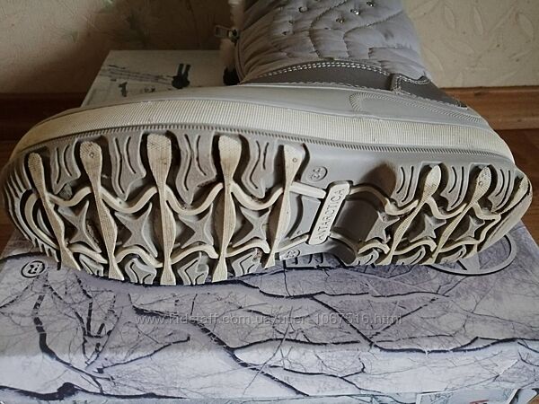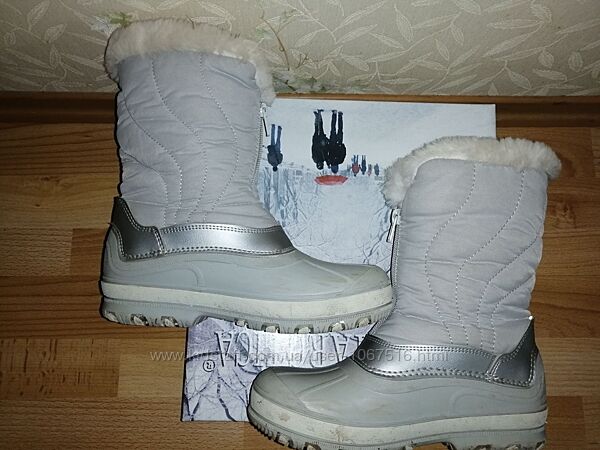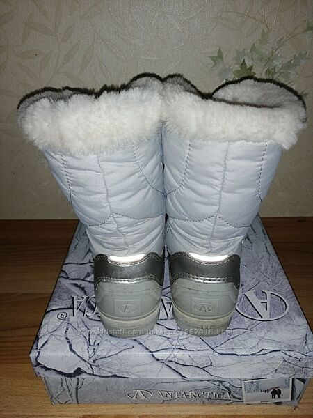 Сапоги в отличном состоянии. Внутри овчина, снаружи комбинированные. Низ выполнен из резины, что делает сапоги практически устойчивыми к любой воду или снегу. Верх кожзам и непромокаемый текстиль. Декорированы стразами. Это отличный вариант на наши слякотные зимы, в них у ребенка будет одновременно сухая нога как в резиновых сапогах и теплая как в зимних ботинках.Фирма Antarctica Италия. Страна проз-ва Румыния. Оригинальная коробка в наличии.