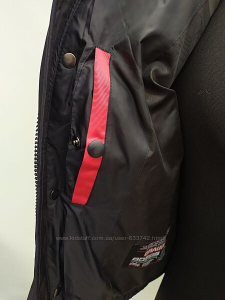 2-а кармана по бокам и один на рукаве. Во внутренней части расположены 2-а боковые кармана и карман для телефона. Куртка застегивается при помощи молнии, и прикрывается планкой с заклепками. Глубокий капюшон свободно наденется на голову и поверх шапки. Он также оснащен кулисой и может регулироваться.