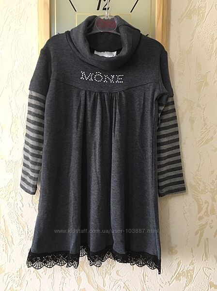 Платье из мягкого вязанного трикотажного полотна, рукав в полоску, украшено кружевами, стразами.Размер: 92 (полномерный)