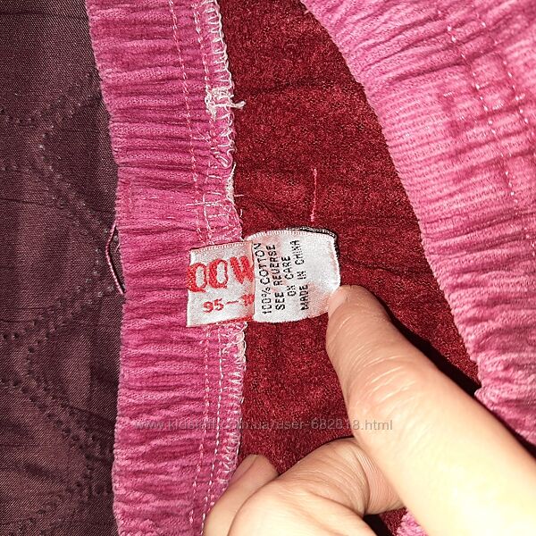Очень классные, теплые вельветовые штаны для девочки. Пояс на резинке и можно вставить еще обычный пояс. Без дефектов, состояние новых.Длина - 49,5см