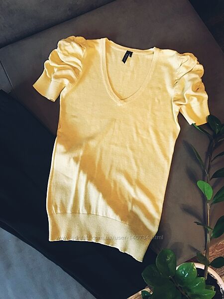 Красива трикотажна кофтинка жовто-гірчичного кольору з V-образним вирізом та об´ємними рукавами-ліхтариками. Стан ідеальний, без нюансів, без торгу. Я б її лишила собі, якби була в розмірі С, але мій розмір вже більший, нажаль.