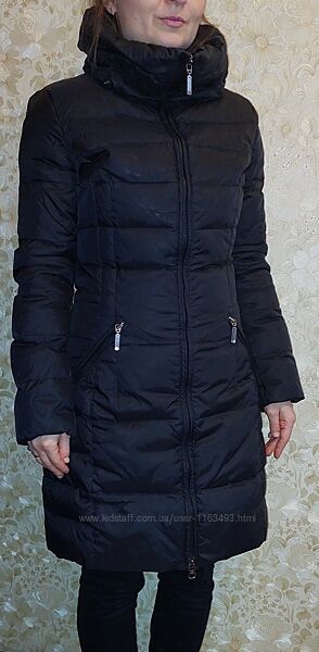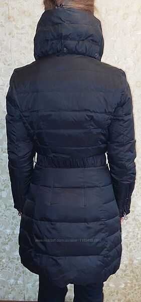 Пальто-пуховик Benetton(80%-пуха и 20%-пера)оригинал,Италия.Размер 40,рост 160см,приталенный черный с поясом,без капюшона,балоний.Центральная молния и 2 кармана на молнии,2 молнии в руковах.Замеры:полуобхват от подмышки до подмышки-46см,длина рукова от ворота-68см,полуобхват талии-38см,длина от плеча и до талии-40см,длина пуховика от плеча и до низа-87см.