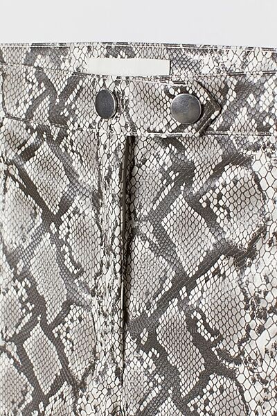 Вузькі укорочені штани зі штучної шкіри з малюнком.Висока талія, а також застібка на блискавку та кнопки.