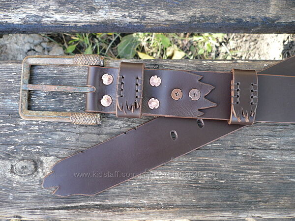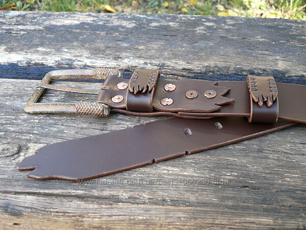 Ремень "Сталкер" . Кожа растительного дубления с матовым покрытием на лицевой поверхности (производство Италии), цвет коричневый-шоколад. Обратная сторона полированная, урез обработан средством tokonole (Япония). Длина 1390 мм (без учета пряжки, ), ширина 40 мм, толщина 3 мм. Пряжка IDAM (Франция) с винтажным покрытием под ржавчину. Пряжка закреплена медными заклепками, запряжник фиксируется ременными винтами. Ручная работа. Цена 900 грн.