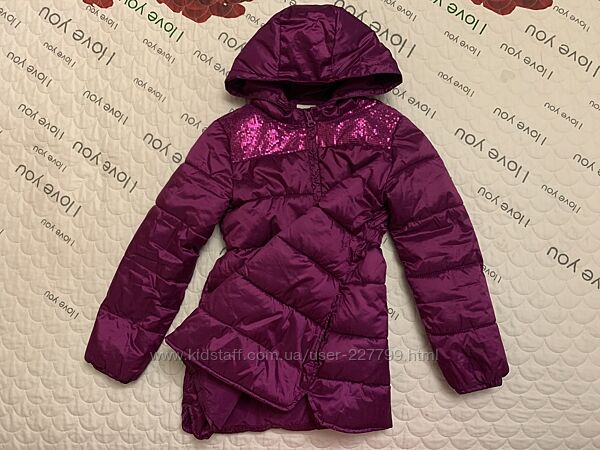 Спереди курточка украшена пайетками. Сзади на уровне талии вшита резиночка. Есть два кармашка в боковых швах. Капюшон не съемный.