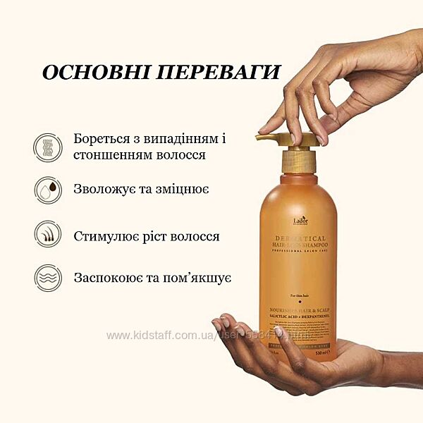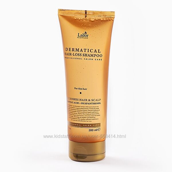 Шампунь проти випадіння волосся Dermatical Hair Loss Shampoo від корейського косметичного бренду La`dor є високоефективним професійним засобом для догляду за волоссям та шкірою голови. Він впливає на шкіру голови та волосяні цибулини, покращує кровообіг і харчування волосяних фолікул, зміцнює волосся, захищає від негативного впливу зовнішнього середовища та стимулює зростання сильного, здорового волосся.