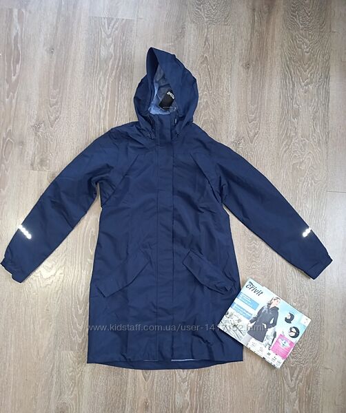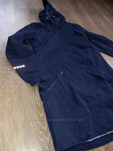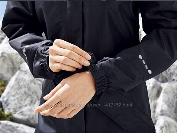 В наявності спортивна куртка, вітровка, дощовик від німецького бренда Crivit, торговий дім Lidl. Гарна модель. Верхній матеріал не пропускає воду і вітер, зберігає комфортну температуру в середині. Верхній матеріал витримує товщину води 3000 мм. Куртка з герметичними швами, є водонепроникна, вітрозахисна, і повітряпропускна завдяки технології BIONIC-FINISH® ECO. Куртка має брудовідштовхуючі властивості, легко очищяється. Без утеплювача. Капюшон не знімається. Ширина талії і низ регулюється, є внутрішня кишеня, манжети теж регулюються на ліпучкі. На рукавах і спині світловідбивні елементи. Розмір 40/42: довжина по спині 94см, ширина під руками 51см, низ 57см, довжина рукава від плеча 66см.