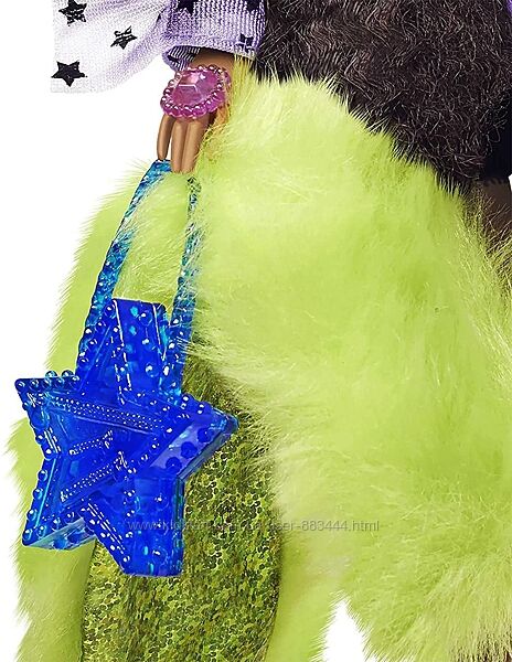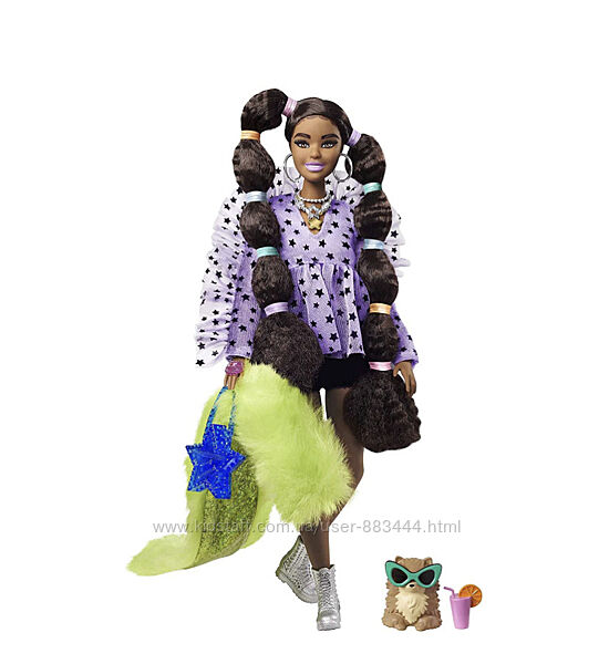 Оригинальная кукла Барби Экстра Модница Barbie Extra Doll. Модная Брюнетка Barbie в лавандовой блузке с оборками и принтом в виде звезд, чёрных шортах с потрепанными краями, неоновой накидке из искусственного меха. Аксессуары: сумка в форме звезды, сапоги, солнцезащитные очки и серебристые украшения. Питомец - щенок Померанского шпица с очками и фруктовым напитком.Возврат и обмен не предусмотрен.
